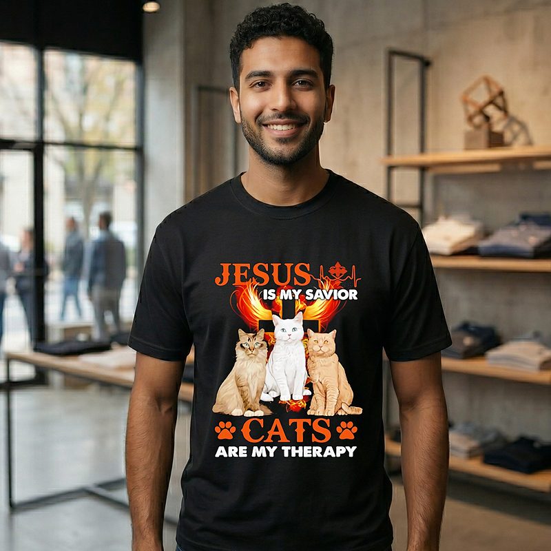 Awesome Jesus Is My Savior Cats Are My Therapy T-Shirt