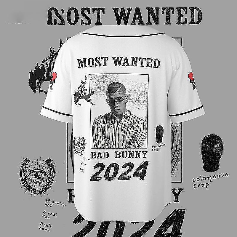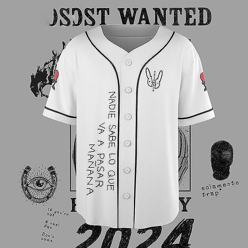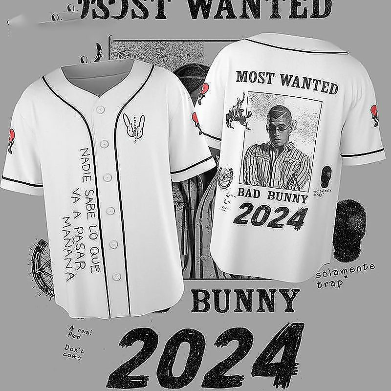 Bad Bunny Most Wanted Tour 2024 Baseball Jersey is a bold, game-day ready baseball jersey designed for comfort and standout style. With its classic button-up look and breathable feel, it’s perfect for casual wear, team vibes, or gifting for any baseball fan. Explore our baseball jersey collection and check out the baseball jersey details and size guide below!