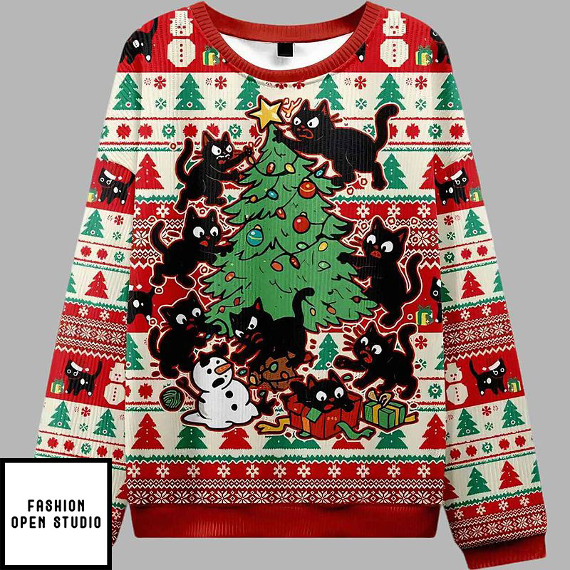 Black Cats Destroying Christmas Tree Ugly Christmas Sweater