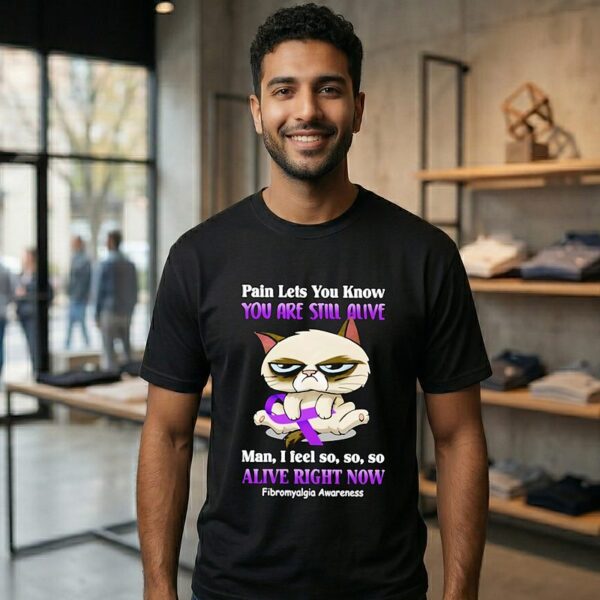 Cat Pain Lets You Know You Are Still Alive Man I Feel So So So Alive Right Now Fibromyalgia Awareness T-Shirt has gone viral on the Internet. Discover the t-shirt below!