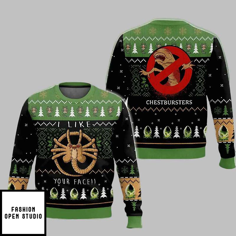 Celebrate the holiday season with Chestbursters Alien Facehugger Ugly Christmas Sweater from our unique ugly sweatshirt collection! This is great for people who struggle to pick between Halloween and Christmas or who like to mix up the holidays. This unique design takes the best parts of both worlds and makes a piece that will get people talking and stand out. Get ready for this masterpiece to turn heads and make people happy!