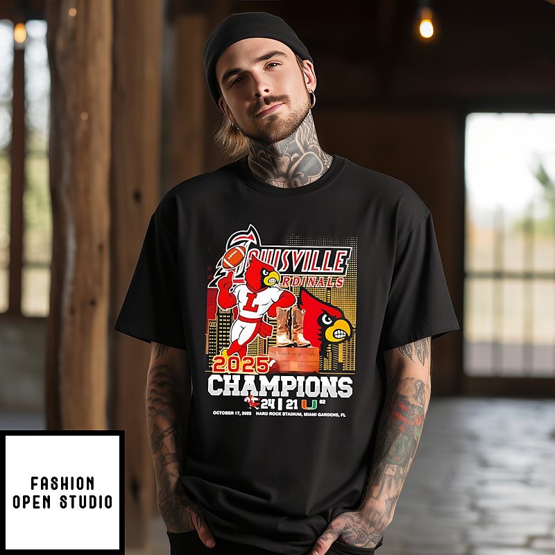 Louisville Cardinals 2025 Champions Hard Rock Miami Gardens Fl Mascot T-Shirt